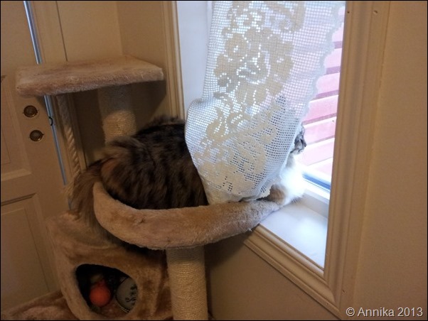 Slik likar ho å ligge å sjå ut, og gardinene ser ut der etter. Men når vi har katt, må dei få lov til litt…